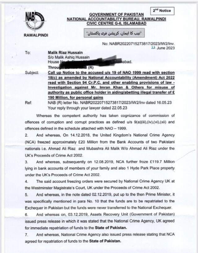 نیب نوٹس کے مطابق پراپرٹی ٹائیکون ملک ریاض نے غیرقانونی 190 ملین پونڈ کی رقم اپنے پاس رکھی اور اس وقت کی کچھ حکومتی شخصیات نے انہیں ناجائز مالی فائدہ دیا ،نیب نے دو روز قبل ملک ریاض کو نوٹس جاری کیا تھا ‘ ریکارڈ بھی طلب کیا گیا ہے،
