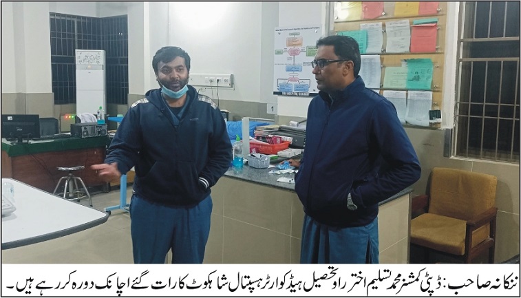 دورے کے دوران ڈپٹی کمشنر نے مختلف شعبہ جات کا معائنہ کیا اور مریضوں سے سہولیات کے حوالے سے دریافت کیا۔ مریضوں نے اسپتال میں طبی سہولیات کی بہترین فراہمی پر اطمینان کا اظہار کیا۔ ڈپٹی کمشنر نے سخت سردی کے باوجود ڈیوٹی سرانجام دینے والے ڈاکٹرز اور عملے کی مکمل حاضری پر اطمینان کا اظہار کرتے ہوئے ان کی کارکردگی کو سراہا۔