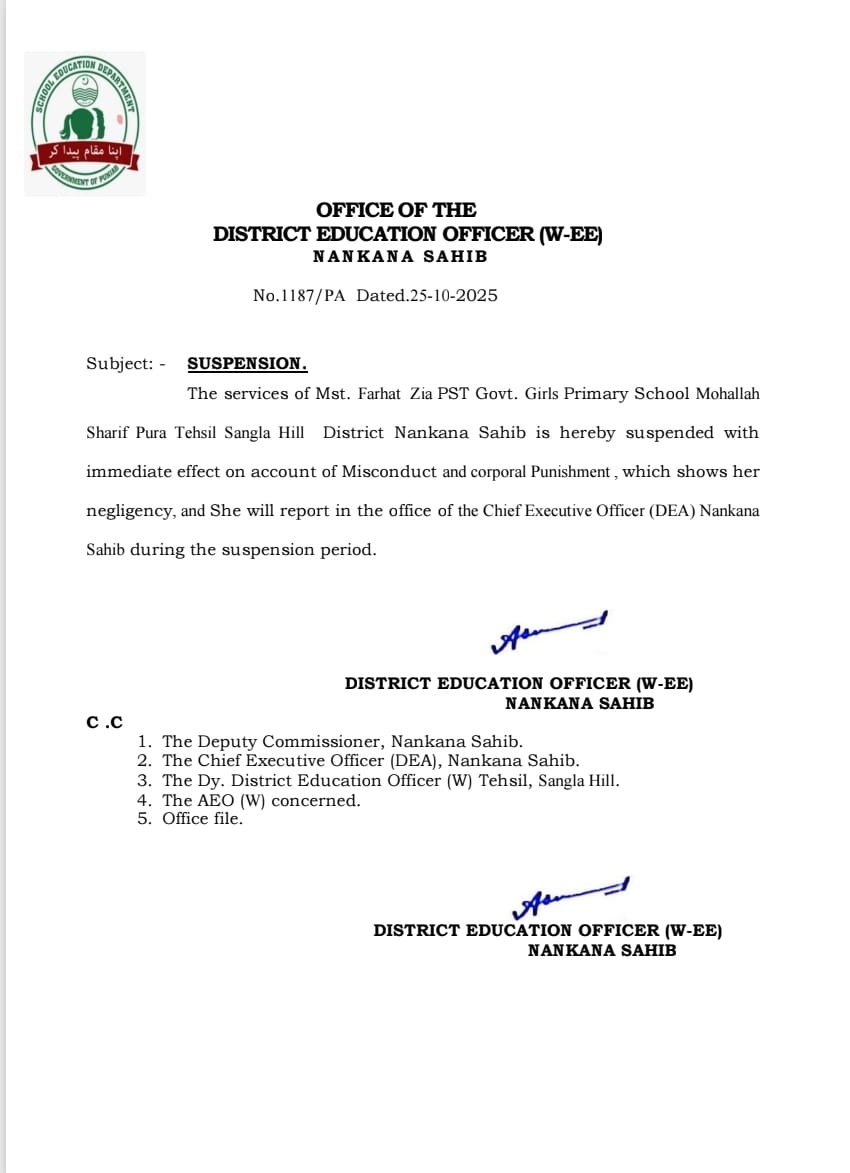 ڈپٹی کمشنر کی ہدایت پر سی ای او ایجوکیشن نے فوری ایکشن لیتے ہوئے خاتون ٹیچر کو مس کنڈکٹ اور بچے پر تشدد کے الزامات کے تحت معطل کر دیا۔ نوٹیفکیشن کے مطابق معطل ہونے والی ٹیچر کو فوری طور پر سی ای او آفس رپورٹ کرنے کی ہدایت جاری کر دی گئی ہے۔