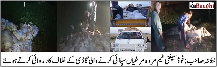 ننکانہ صاحب، باغی ٹی وی( نامہ نگار احسان اللہ ایاز)پنجاب فوڈاتھارٹی نے فیصل آباد سے ننکانہ ترسیل کی جانے والی مردہ مرغیوں کی بڑی کھیپ دھر لی،مقدمہ درج ،گاڑی پولیس کے حوالے