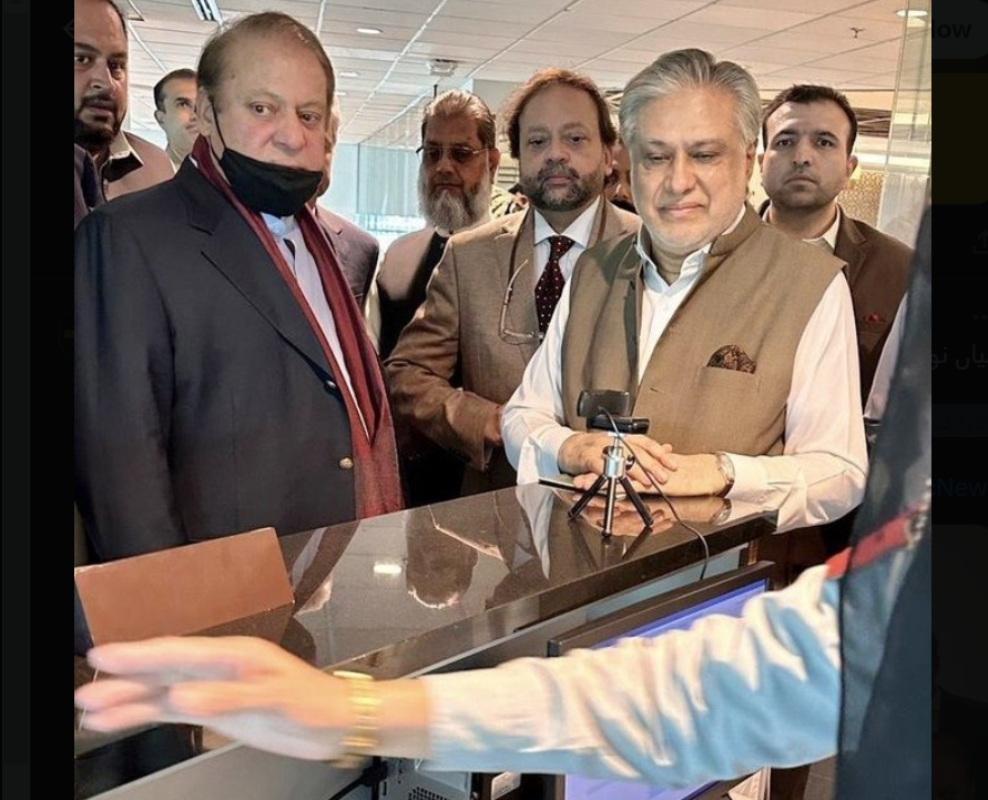 نادرا کی ٹیم اسلام آباد ایئر پورٹ پہنچی اور نواز شریف نے بائیو میٹرک کروائی، ایئر پورٹ پر اعظم نذیر تارڑ، عطا تارڑ کے ساتھ نواز شریف نے مشاورت کی، نواز شریف کی امیگریشن کا عمل مکمل کر لیا گیا، نواز شریف کے ہمراہ سیکورٹی سٹاف بھی ہے، نواز شریف نے جہاز سے نکلتے وقت کہا تھا کہ وہ چند منٹوں میں دوبارہ واپس آ رہے ہیں،قانونی امور پر گیسٹ ہاؤس میں نواز شریف نے مشاورت کی.اسحاق ڈار ، اعظم نذیر تارڑ، بیرسٹر ظفر اللہ خان نے نواز شریف سے مشاورت کی،نواز شریف نے تمام دستاویزات پر دستخط کردئیے ،نواز شریف 2019 کے بعد آج پاکستان واپس آئے، بیمار ہو کر نواز شریف پاکستان سے علاج کے لئے گئے تھے تا ہم لندن میں ہی مقیم رہے .