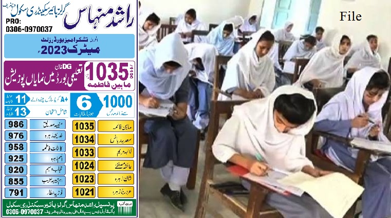 ہونہار طالبہ مابین فاطمہ 1035 سعدیہ ریاض 1034 ثانیہ مریم 1033 عائشہ مصطفیٰ 1024 شان زہرہ 1023 عروج زہرہ 1021 منیبہ صدیق 986 خدیجہ زہرہ 976 کائنات فاطمہ 958 انعم زہرہ 925 حجاب وسیم 920 ام حبیبہ حبیب 855فوزیہ عطا 791 اوردیگر طالبات نے شاندار کامیابی حاصل کی پرنسپل ادارہ نے تمام طالبات اور سٹاف کو اِس شاندار کامیابی پر مبارک باد دی ۔