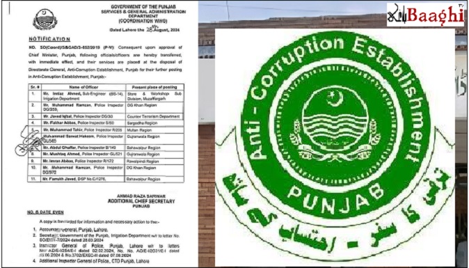تفصیل کے مطابق پنجاب حکومت نے صوبے میں کرپشن کے خلاف اپنی مہم کو مزید تقویت دینے کے لیے ایک اہم قدم اٹھاتے ہوئے پولیس کے 11 افسران کو محکمہ اینٹی کرپشن میں منتقل کر دیا ہے۔ان تبادلوں کی منظوری وزیراعلیٰ پنجاب مریم نوازشریف نے دی ہے۔