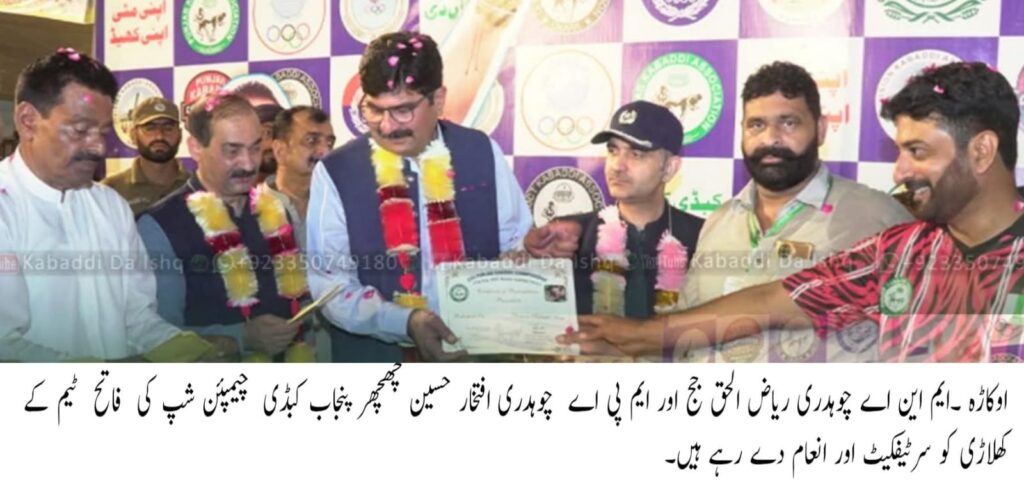 اوکاڑہ (نامہ نگار ملک ظفر) جناح اسٹیڈیم اوکاڑہ میں پنجاب کبڈی چیمپئن شپ 2025 کے شاندار مقابلوں کا انعقاد کیا گیا، جس میں پنجاب بھر کی ڈویژنز سے نامور کبڈی ٹیموں نے حصہ لیا۔ مقابلوں میں شائقین کبڈی کی بڑی تعداد اسٹیڈیم میں موجود رہی اور کھلاڑیوں کے فن کو خوب سراہا۔
