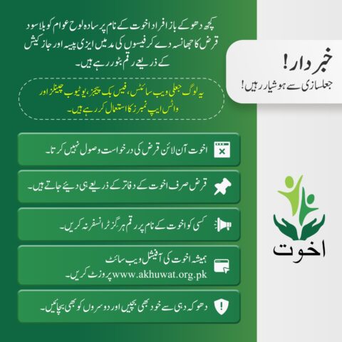 بعض جعلساز گروہ سادہ لوح عوام کو "بلاسود قرض” دینے کا جھانسہ دے کر ان سے ایزی پیسہ یا جاز کیش کے ذریعے فیسوں کی مد میں رقم وصول کر رہے ہیں۔ یہ گروہ سوشل میڈیا، یوٹیوب چینلز، فیس بک پیجز، اور جعلی واٹس ایپ نمبرز کے ذریعے اخوت کے نام پر عوام کو گمراہ کر رہے ہیں۔اخوت انتظامیہ کی جانب سے واضح کیا گیا ہے کہ اخوت فاؤنڈیشن کبھی بھی آن لائن قرض کی درخواست وصول نہیں کرتا۔قرض صرف اخوت کے دفاتر کے ذریعے ہی دیا جاتا ہے۔ادارے کی کوئی بھی فیس یا رقم ایزی پیسہ/جاز کیش کے ذریعے وصول نہیں کی جاتی۔کسی کو اخوت کے نام پر پیسے ٹرانسفر نہ کریں، چاہے وہ کتنا ہی معتبر دکھائی دے۔عوام سے اپیل کی گئی ہے کہ وہ صرف اور صرف اخوت کی آفیشل ویب سائٹ www.akhuwat.org.pk سے ہی معلومات حاصل کریں اور کسی بھی مشکوک لنک یا پیغام کو نظرانداز کریں۔