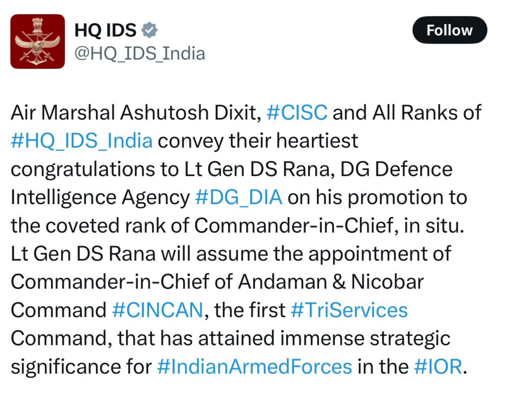 نئی دہلی (باغی ٹی وی مانیٹرنگ ڈیسک) بھارت کی ڈیفنس انٹیلی جنس ایجنسی (ڈی آئی اے) کے ڈائریکٹر جنرل لیفٹیننٹ جنرل ڈی ایس رانا کو عہدے سے ہٹا کر انڈمان و نکوبار کمانڈ کے کمانڈر ان چیف کے طور پر بھیج دیا گیا ہے۔ بھارتی فوج کی تاریخ میں اس سطح کی برطرفی اور تبادلہ ایک غیر معمولی قدم سمجھا جا رہا ہے، جس نے سیکیورٹی اداروں کے اندرونی انتشار اور خفیہ نظام کی کمزوریوں کو بے نقاب کر دیا ہے۔