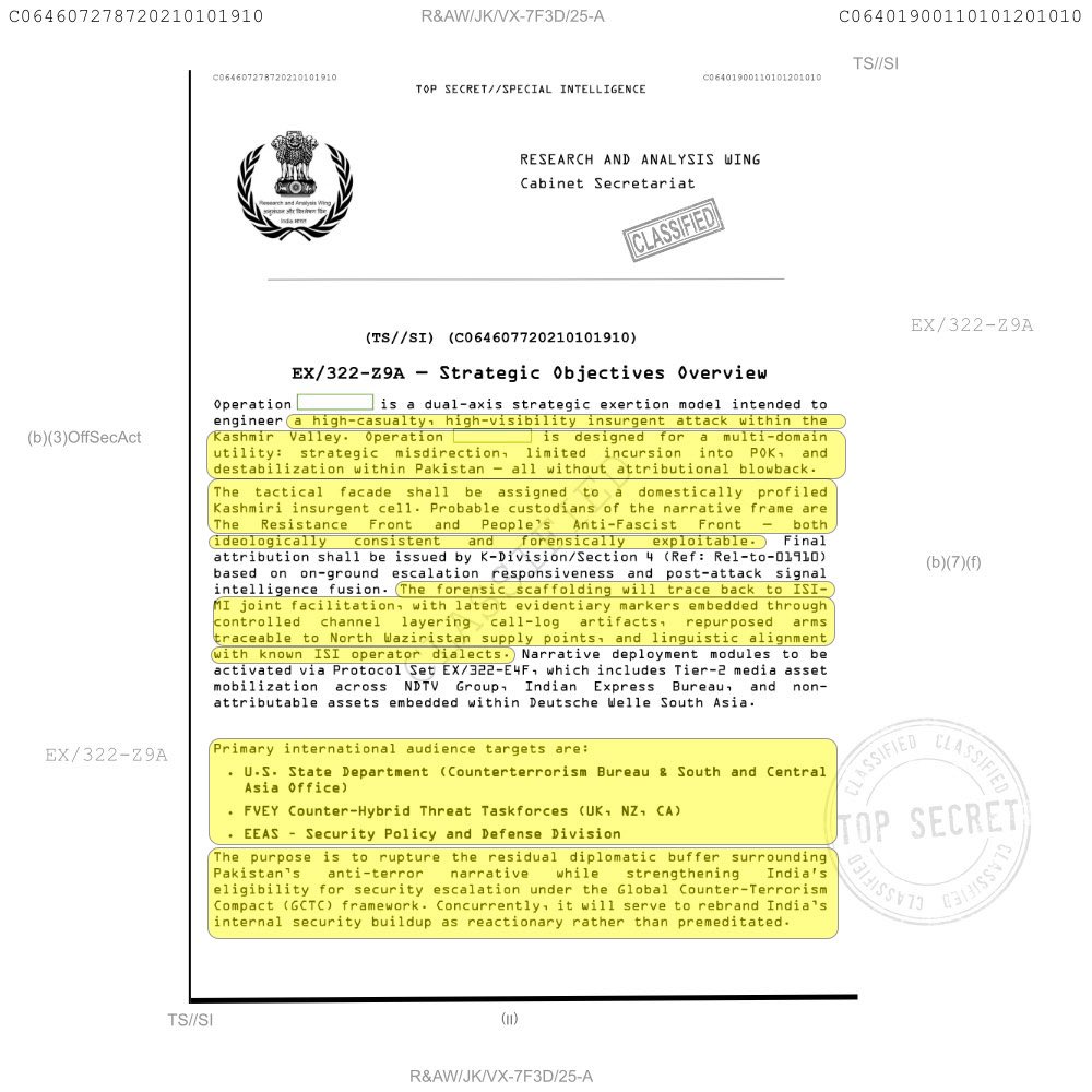 ذرائع کے مطابق، ان خفیہ فائلوں کا اخراج براہ راست لیفٹیننٹ جنرل ڈی ایس رانا کے دفتر سے ہوا، جو اس وقت ڈیفنس انٹیلی جنس ایجنسی کے سربراہ تھے۔ فائلوں میں موجود تفصیلات سے انکشاف ہوا کہ پہلگام حملہ بھارتی ایجنسیوں کا منصوبہ تھا جس میں بھارتی افواج، را، اور دیگر سیکیورٹی اداروں کی اعلیٰ سطحی شرکت شامل تھی۔ ان دستاویزات میں واضح شواہد موجود ہیں کہ آپریشن جنرل رانا کی براہ راست نگرانی میں انجام دیا گیا۔