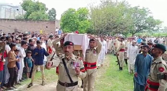 پاک فوج کے چاک و چوبند دستہ نے شہید کے جسد خاکی کو خصوصی گارڈ آف آنر بھی پیش کیا،وطن میں امن کی خاطر جان قربان کرنے والے سپوت کے نماز جنازہ میں شہریوں کی کثیر تعداد موجود تھی۔