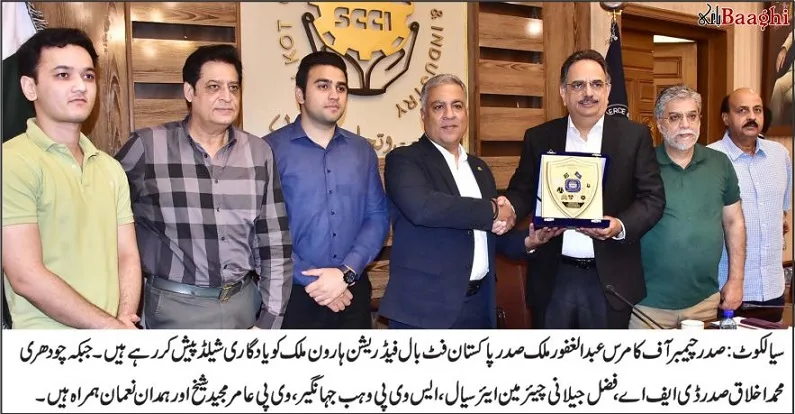 سیالکوٹ، باغی ٹی وی( بیوروچیف شاہد ریاض سے)پاکستان فٹبال فیڈریشن کے صدر ہارون احمد ملک نے وفد کے ہمراہ سیالکوٹ چیمبر آف کامرس اینڈ انڈسٹری کا دورہ کیا اور سیالکوٹ میں فٹ بال کے فروغ کے لیے تبادلہ خیال کیا گیا ۔