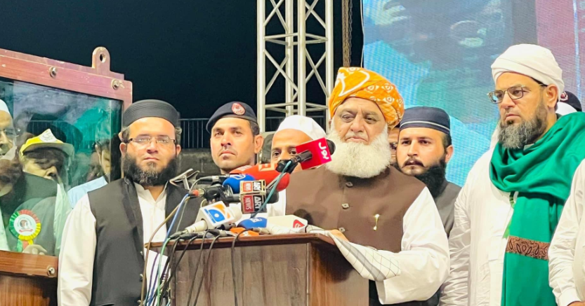 مولانا فضل الرحمان کا کہنا تھا کہ پاکستان دنیا کی 24 ویں بڑی معیشت تھا پھر 2018 میں ایک تجربہ کیا گیا اور پاکستان 47 ویں نمبر پہ چلا گیا۔ اگر یہ نہ کیا ہوتا آج ہم بھارت کے G-20 اجلاس میں شرکت کرتے لیکن ایک تجربے نے ہماری معیشت تباہ و برباد کر دی گئی۔جب تک ہم رسول اللہ صلی اللہ علیہ وسلم کے دیئے ہوئے نظام کو پاکستان کا نظام نہیں بناتے تب تک ہم اللہ کی رحمت کے مستحق نہیں ہوسکے گے اور جب اللہ تعالیٰ کی رحمت نہیں ہوگی تو یا بدامنی ہوگی اور یا خراب معیشت, بھوک و افلاس کا شکار ہونگے ،بازار میں ننگے تڑنگے کھڑے ہو کر ہاتھ میں تختی پکڑ لینا جس پہ لکھا ہو "لوگوں حیاء کرو” اس قماش کے لوگوں سے ہمارا واسطہ پڑا ہے ،چائنہ، متحدہ عرب امارات اور سعودی عرب مٹھی بند کر کے بیٹھے ہیں کہ اگر ہم پاکستان کو پیسہ دیتے ہیں اور عمران خان حکومت میں آ جاتا ہے تو ہمارا پیسہ ڈوب جائے گا لیکن جسے یہ چور کہتا ہے اسے پیسہ دینے کو سب تیار ہیں۔