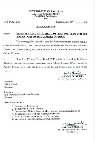 اس اقدام سے سیکرٹری آئی پی سی بھی بورڈ آف گورنرز کے رکن نہیں رہیں گے جن کی جگہ وزیراعظم آفس یا کیبنٹ ڈویژن کی جانب سے پی سی بی کے بورڈ آف گورنرز میں نمائندگی دی جائے گی، دوسری جانب کابینہ ڈویژن نے وزیراعظم کی منظوری کے بعد نوٹیفکیشن بھی جاری کردیا ہے، واضح رہے کہ پی سی بی سے متعلق تمام نوٹیفکیشنز پہلے وزارت آئی پی سی جاری کرتی تھی۔