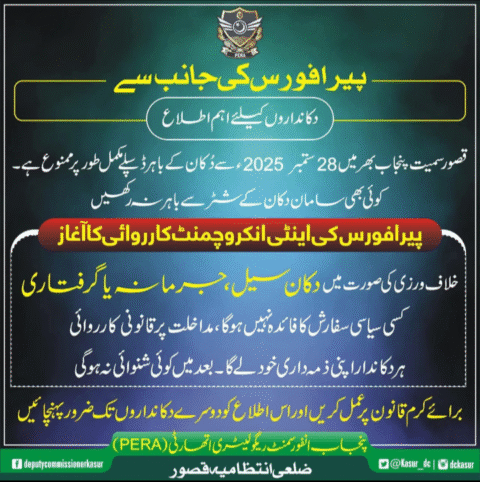 تفصیلات کے مطابق پنجاب انفورسمنٹ ریگولیٹری اتھارٹی (پیرا فورس) نے صوبے بھر کے دکانداروں کو خبردار کیا ہے کہ 28 ستمبر سے دکان کے باہر کسی بھی قسم کا ڈسپلے مکمل طور پر ممنوع ہو گا