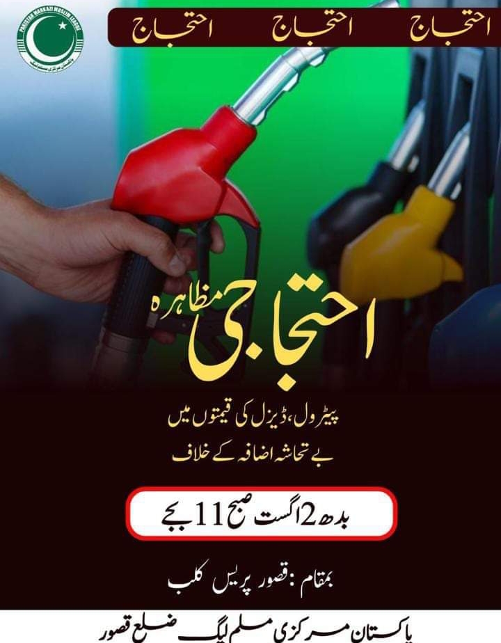 آج دن گیاراں بجے پریس کلب قصور کے باہر سیاسی جماعت مرکزی مسلم لیگ پاکستان قصور احتجاجی مظاہرہ کرے گی جس میں پیٹرولیم مصنوعات کی قیمتوں میں اضافے کے خلاف مظاہرہ کیا جائے گا