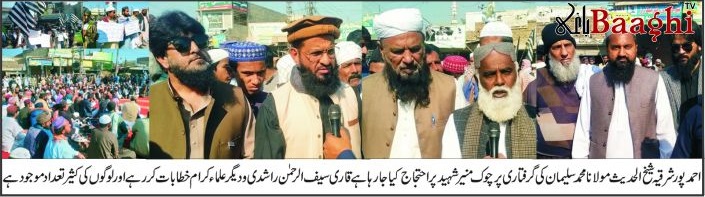 اوچ شریف،باغی ٹی وی(نامہ نگارحبیب خان) جمیعت علماء اسلام کے رہنماؤں اور کارکنوں نے چوک منیر شہید احمدپور شرقیہ میں احتجاج کیا، جس کی قیادت قاری سیف الرحمن راشدی اور مولانا پیر حماد اللہ نے کی۔ مظاہرین نے رہنما شیخ الحدیث جامعہ دارالفتیحہ مولانا محمد سلیمان کی گرفتاری پر شدید احتجاج کیا اور ان کی فوری رہائی کا مطالبہ کیا۔