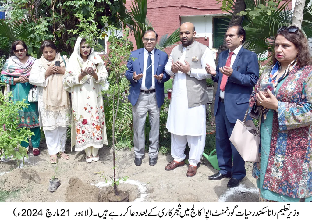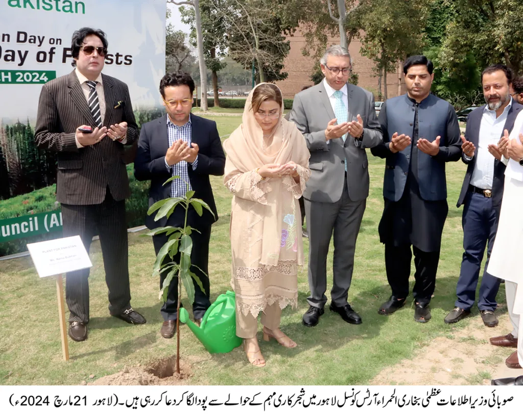 وزیر اعلیٰ پنجاب مریم نواز کے وژن کے مطابق صوبائی وزیر اطلاعات عظمیٰ بخاری نے پنجاب میں شجر کاری مہم کے حوالے سے الحمراء آرٹس کونسل میں پودا لگایا۔ اس موقع پر ان کا کہنا تھا کہ درخت لگائیں، امید جگائیں اور ماحول بچائیں۔پنجاب بھر میں موسم بہار کی شجر کاری مہم کے دوران 10 ملین پودے لگائے جائیں گے۔ درخت لگانا قومی فریضہ اور سماجی ذمہ داری بھی ہے۔ انہوں نے کہا کہ شہری شجرکاری مہم میں بڑھ چڑھ کر حصہ لیں اور درختوں کی دیکھ بھال بھی کریں۔ پودا لگالینا ہی کافی نہیں بلکہ اس کی حفاظت بھی اتنی ہی اہم ہے۔ ماحول کو فضائی آلودگی سے پاک کرنے کے لئے ہر شہری اپنا کردار ادا کرے۔محکمہ جنگلات اور پی ایچ اے صوبے بھر میں مفت پودے فراہم کر رہے ہیں۔ سیکرٹری اطلاعات و ثقافت دانیال گیلانی اور دیگر حکام بھی اس موقع پر موجود تھے