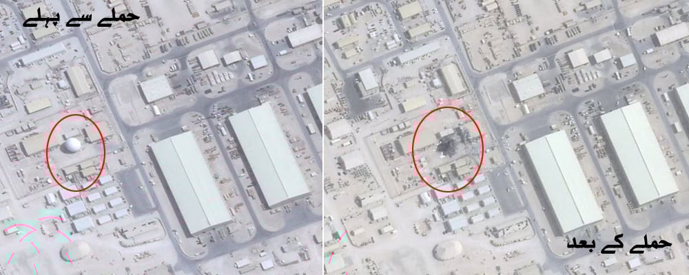 امریکی دفاعی محکمے پینٹاگون نے بالآخر قطر میں واقع العدید ائیر بیس پر ایرانی بیلسٹک میزائل حملے کی تصدیق کردی ہے،حملے سے پہلے اور بعد کی جاری کردہ سیٹلائٹ تصاویر میں اڈے کے مواصلاتی ڈوم کو پہنچنے والی شدید تباہی واضح طور پر دیکھی جاسکتی ہے۔