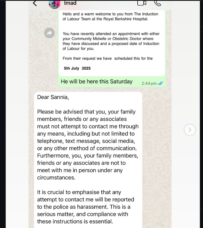 گزشتہ چند دنوں کے دوران ثانیہ اشفاق نے انسٹاگرام پر متعدد پیغامات شیئر کیے جن میں انہوں نے 37 سالہ کرکٹر پر بے وفائی، بچوں کو نظر انداز کرنے اور اسقاطِ حمل پر مجبور کرنے جیسے سنگین الزامات عائد کیے،ثانیہ اشفاق نے جولائی 2025 کی واٹس ایپ چیٹس کے اسکرین شاٹس شیئر کیے ہیں، مبینہ پیغامات میں کرکٹر نے خبردار کیا ہے کہ اگر انہوں نے ان (ثانیہ) سے یا اہلخانہ سے رابطہ کیا تو وہ قانونی کارروائی کریں گے،اسکرین شاٹس کے مطابق ثانیہ جو اُس وقت حاملہ تھیں، انہوں نےعماد وسیم سے بچے کی پیدائش کے موقع پر موجود رہنے کی درخواست کی تھی تاہم کرکٹر نے سخت جواب دیتے ہوئے شرائط پر عمل نہ کرنے پر مبینہ طور پر پولیس میں شکایت کی دھمکی دی تھی۔