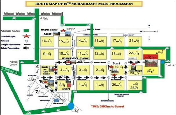 سرگودھاشہر میں تین جلوس برآمد ہونگےجو مقررہ راستوں سے ہوتے ہوئے ایک مقام پر اکٹھے ہوں گےاور مرکزی جلوس کی شکل اختیار کر لیں گے