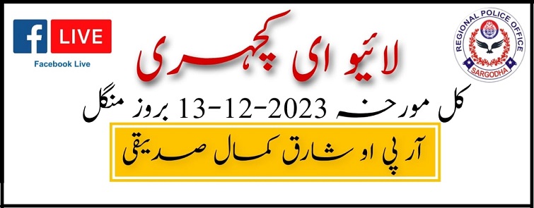 ریجنل پولیس آفیسر شارق کمال صدیقی مورخہ 13-12-2023 بروز بدھ بوقت 03 بجے دن آر پی او سرگودھا کے آفیشل فیس بک پیج پر آن لائن ای کچہری کا انعقاد کریں گئے۔