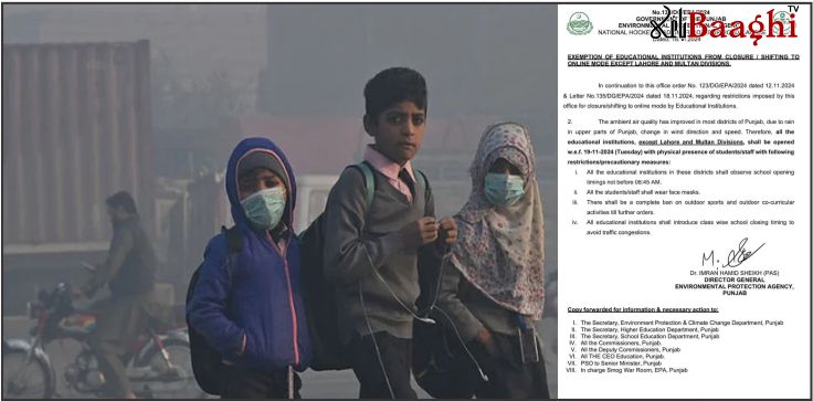 بالائی علاقوں میں بارش کے باعث پنجاب کے بیشتر اضلاع میں فضائی معیار میں بہتری آئی ہے، جس کے بعد تعلیمی اداروں کی دوبارہ کھولنے کی اجازت دی گئی ہے۔ سکول انتظامیہ کو احتیاطی تدابیر پر عمل درآمد کی ذمہ داری سونپی گئی ہے۔