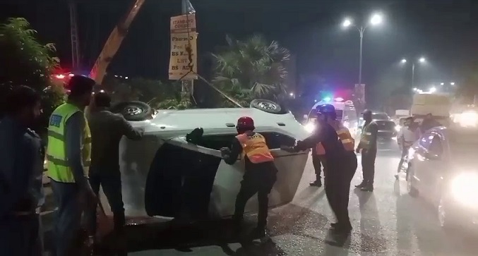 کار ڈرائیور کے مطابق دوران ڈرائیونگ اچانک میری آنکھوں کے سامنے اندھیرا آگیا اور گاڑی فٹ پاتھ سے ٹکرا گئی اور ٹائرپھٹنے کی وجہ سے الٹ گئی تاہم کارمیں بیٹھے افراد محفوظ رہے جبکہ کار بری طرح تباہ ہوگئی،