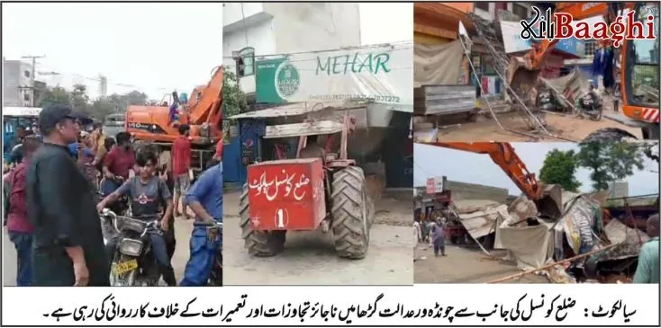 سیالکوٹ،باغی ٹی وی( بیوروچیف شاہد ریاض سے)ضلع کونسل سیالکوٹ کا چونڈہ، عدالت گڑھا اور اگوکی روڈ پر ناجائز تعمیرات اور تجاوزات کے خلاف گرینڈ آپریشن ، ہیئوی مشینری کے ذریعے 105 تجاوزات کو مسمار کردیا گیا جبکہ 64 غیر قانونی اور نقشہ کے بغیر تعمیرو بلڈنگز کو سر بمہر کردیا۔