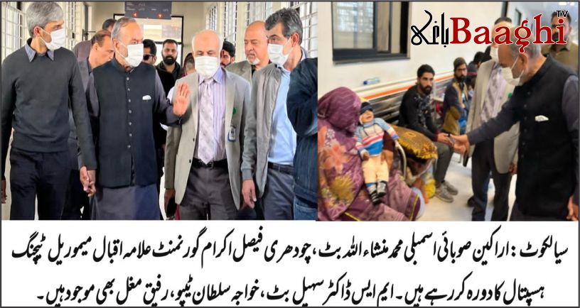 سیالکوٹ (باغی ٹی وی،بیوروچیف شاہدریاض) رکن صوبائی اسمبلی محمد منشاء اللہ بٹ اور چوہدری فیصل اکرام نے گورنمنٹ علامہ اقبال میموریل ٹیچنگ ہسپتال کا دورہ کیا، جہاں انہوں نے زیر علاج مریضوں کی عیادت کی اور انہیں فراہم کی جانے والی طبی سہولیات کے معیار کا جائزہ لیا۔