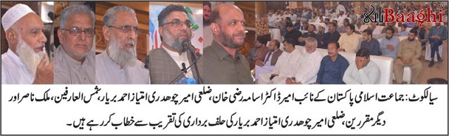 سیالکوٹ (باغی ٹی وی بیوروچیف شاہد ریاض) جماعت اسلامی پاکستان کے نائب امیر ڈاکٹر اسامہ رضی خان نے سیالکوٹ میں جماعت اسلامی ضلع سیالکوٹ کے امیر چوہدری امتیاز احمد بریار کی حلف برداری کی تقریب میں بطور مہمان خصوصی خطاب کرتے ہوئے کہا کہ عالمی طاقتوں کی کاسہ لیسی کے باوجود پاکستان کی عوام کو ابھی تک حقیقی آزادی حاصل نہیں ہوئی۔ڈاکٹر اسامہ رضی خان نے جماعت اسلامی کے آئینی اصولوں پر زور دیتے ہوئے کہا کہ جماعت اسلامی پاکستان کے آئین کو تمام اکائیوں اور مکاتب فکر کے متفقہ معاہدہ کے طور پر دیکھتی ہے۔ انہوں نے حکومت کو تنقید کا نشانہ بناتے ہوئے کہا کہ موجودہ حکومت کی کوئی اخلاقی حیثیت نہیں جو فارم 47 کی بنیاد پر تشکیل پائی ہے۔انہوں نے جماعت اسلامی کی ممبر شپ مہم اور بجلی کے بلوں کے خلاف دھرنوں کی کامیابی کا ذکر کیا، جس کے نتیجے میں محب وطن طبقہ، نوجوان اور خواتین جماعت اسلامی کی طرف متوجہ ہوئے ہیں۔ اس کے علاوہ، اس تقریب میں ممبر شپ مہم کی کامیابی پر کارکنوں کو شیلڈز بھی تقسیم کی گئیں۔