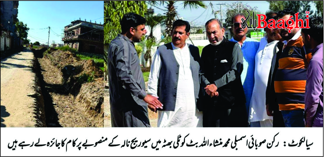 سیالکوٹ (بیوروچیف شاہد ریاض) رکن صوبائی اسمبلی محمد منشاء اللہ بٹ نے کوٹلی بھٹہ کے دورے کے دوران اعلان کیا ہے کہ کوٹلی بھٹہ میں سیوریج اور بارش کے پانی کے نکاس کے مسئلے کے حل کے لیے ڈیڑھ کروڑ روپے کی لاگت سے 23 سو فٹ طویل نالہ کی تعمیر آئندہ 15 دنوں میں مکمل کر لی جائے گی۔ یہ منصوبہ عید کے فوراً بعد عوام کو سہولیات فراہم کرنے کے قابل ہو جائے گا۔