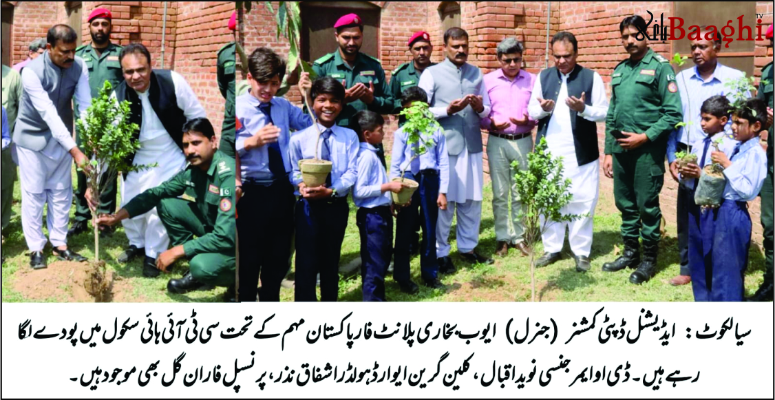 سیالکوٹ ،باغی ٹی وی( سٹی رپورٹر مدثر رتو)ایڈیشنل ڈپٹی کمشنر (جنرل) سیالکوٹ ایوب بخاری نے کہا ہے کہ پاکستان اس وقت موسمیاتی تبدیلیوں اور ماحولیاتی آلودگی جیسے سنگین مسائل کا شکار ہے، ان چیلنجز سے نمٹنے کا واحد حل زیادہ سے زیادہ شجرکاری ہے۔