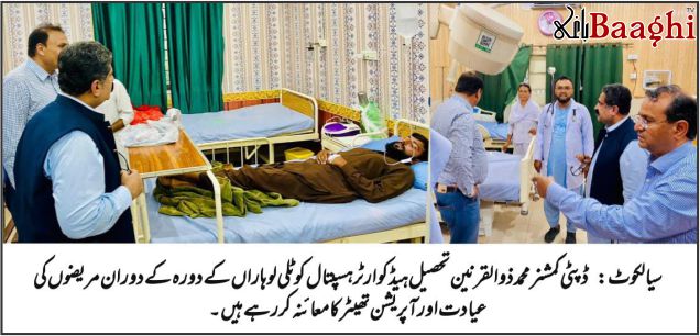 سیالکوٹ (باغی ٹی وی،بیوروچیف شاہدریاض)ڈپٹی کمشنر سیالکوٹ محمد ذوالقرنین نے اچانک تحصیل ہیڈ کوارٹر ہسپتال کوٹلی لوہاراں کا دورہ کیا۔ انہوں نے سیکنڈ شفٹ کے دوران عملے کی حاضری چیک کی اور مختلف وارڈز میں زیر علاج مریضوں کی عیادت کرتے ہوئے فراہم کی جانے والی طبی سہولیات کا جائزہ لیا۔