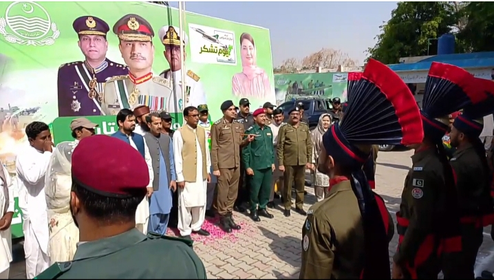 ڈیرہ غازی خان میں یوم تشکر کی تقریبات پولیس لائنز اور ضلع کونسل ہال میں ہوئیں۔ آر پی او کیپٹن (ر) سجاد حسن، کمشنر اشفاق چوہدری، ایم پی اے حنیف پتافی و دیگر نے شہداء کی فیملیز کے ساتھ شرکت کی۔ پولیس، جیل پولیس، بارڈر ملٹری پولیس اور ریسکیو کے دستوں نے سلامی دی، پھول پیش کیے گئے اور قومی ترانے گائے گئے۔ طلباء نے ملی نغمے اور خاکے پیش کیے۔ مقررین نے کہا کہ پاک فوج کی جرات نے قوم کا سر فخر سے بلند کر دیا، دشمن کو تاریخی شکست دی گئی، اور اب پوری دنیا پاکستان کی عسکری صلاحیت کی معترف ہے۔