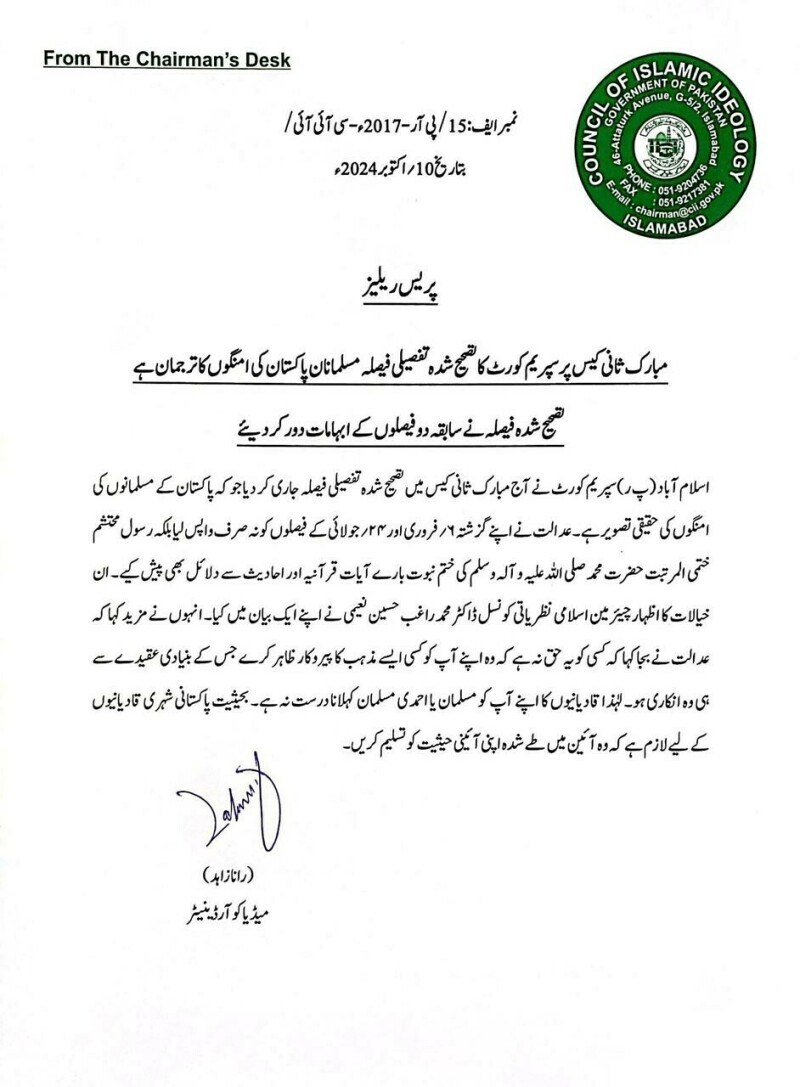 چیئرمین اسلامی نظریاتی کونسل، ڈاکٹر محمد راغب حسین نعیمی نے سپریم کورٹ کے فیصلے کے بعد اس معاملے پر اپنی گہری تشویش اور خیال کا اظہار کیا۔ انہوں نے کہا کہ عدالت نے اپنے فیصلے میں رسول اللہ صلی اللہ علیہ وآلہ وسلم کی ختم نبوت کے بارے میں قرآن کی آیات اور احادیث کی روشنی میں واضح دلائل پیش کیے ہیں۔ ان کے مطابق، یہ فیصلہ ملک میں موجود مذہبی ہم آہنگی کی ضرورت کو بھی اجاگر کرتا ہے اور واضح کرتا ہے کہ اسلام کے بنیادی عقائد کے خلاف جانے کی اجازت نہیں دی جا سکتی۔ڈاکٹر نعیمی نے اس بات پر زور دیا کہ کسی بھی فرد یا گروہ کو یہ حق نہیں ہے کہ وہ اپنے آپ کو ایسے مذہب کا پیروکار ظاہر کرے جس کے بنیادی عقائد سے وہ انکاری ہو۔ ان کا کہنا تھا کہ قادیانیوں کا اپنے آپ کو مسلمان یا احمدی مسلمان کہلانا درست نہیں ہے، کیونکہ اس سے اسلامی عقائد کی بنیاد پر سوالات اٹھتے ہیں۔ انہوں نے واضح کیا کہ قادیانیوں کو چاہیے کہ وہ اپنے مذہب کی حقیقت کو تسلیم کریں اور اس کے مطابق اپنی شناخت کو واضح کریں۔انہوں نے مزید کہا کہ بحیثیت پاکستانی شہری قادیانیوں کے لیے ضروری ہے کہ وہ آئین میں طے شدہ اپنی آئینی حیثیت کو تسلیم کریں۔ یہ بات اہم ہے کہ آئین پاکستان میں واضح طور پر قادیانیوں کی مذہبی حیثیت کو بیان کیا گیا ہے، اور اس کی پیروی کرنا ہر شہری کا فرض ہے۔ ڈاکٹر نعیمی نے یہ بھی کہا کہ یہ فیصلہ مسلمانوں کے درمیان اتحاد کی ضرورت کو بھی اجاگر کرتا ہے، اور انہیں چاہیے کہ وہ ایک دوسرے کی مذہبی حساسیت کا احترام کریں۔