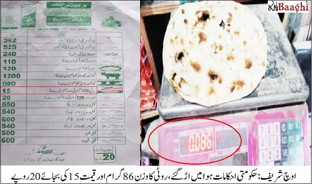 اوچ شریف سمیت گردونواح میں تندور اور ہوٹل مالکان نے نان و روٹی کے من مرضی نرخ مقرر کرکے مہنگے داموں نان و روٹی کی فروخت شروع کر رکھی ہے، روٹی کے مقررہ وزن 100گرام کی بجائے 86 گرام اور روٹی کی قیمت 15 روپے کی بجائے 20 روپے میں فروخت جاری ہے،