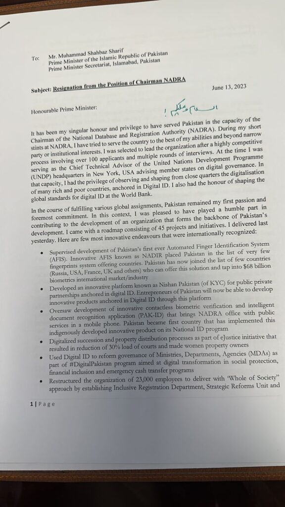 وزیر اعظم نے چیئرمین نادرا کا استعفی منظور کرلیا