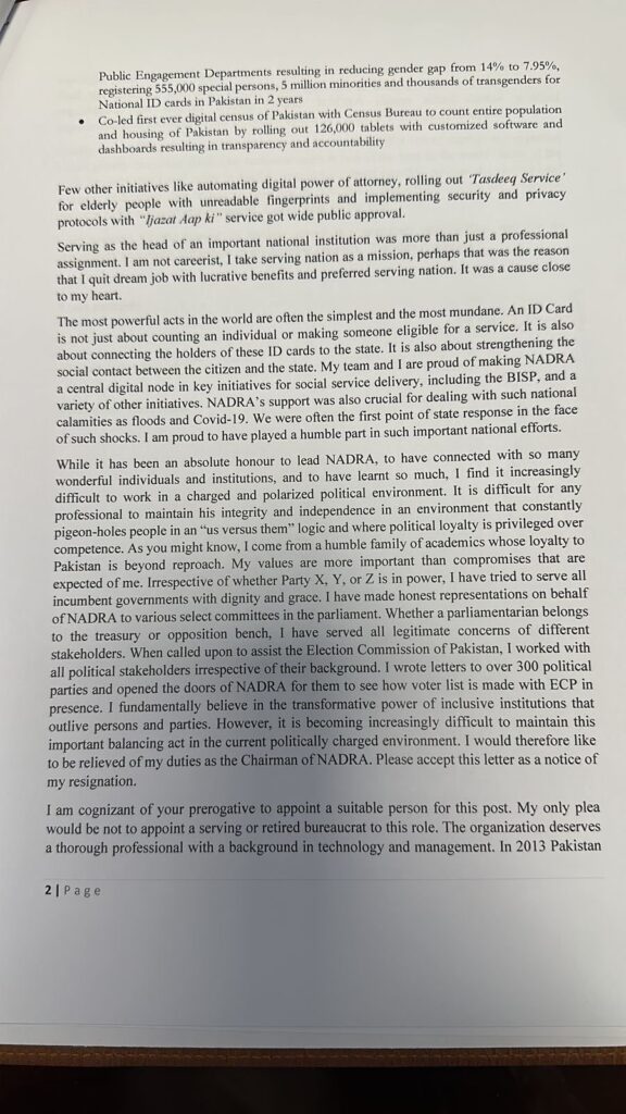 چیرمین نادرا طارق ملک نے موجودہ کشیدہ سیاسی صورتحال کے تناظر میں دیا ،باخبرزرائع کے مطابق چیئرمین نادرا کا استعفیٰ منظور کر لیا گیا ہے، چیرمین نادرا کے استعفی کی کاپی سامنے آ گئی تین صفحات پر مشتمل استعفے میں چیرمین نادرا نے کشیدہ سیاسی صورتحال کو وجہ بنایا چیرمین نادرا طارق ملک نے استعفے میں اپنی کارکردگی اور پراجیکٹس کی تفصیلات بتائیں طارق ملک نے حاضر سروس یا ریٹائرڈ بیوروکریٹ کو چیرمین نادرا کی پوسٹ نہ دینے کی سفارش کی ،طارق ملک نے استعفے میں کہا کہ موجودہ کشیدہ سیاسی صورتحال میں کسی پروفیشنل کے لئے ساکھ اور آزادی برقرار رکھنا مشکل ہے،