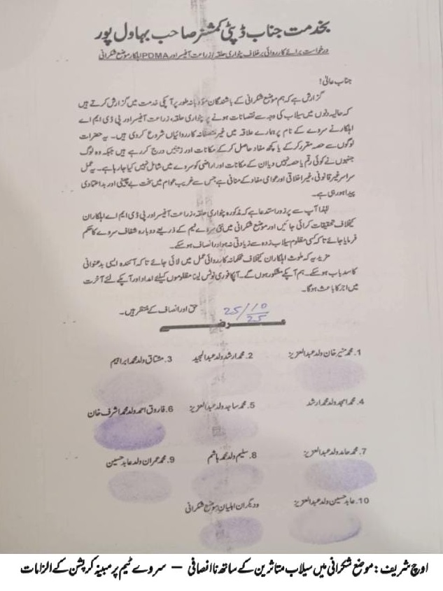 متاثرین نے ڈپٹی کمشنر بہاولپور کو جمع کرائی گئی تحریری درخواست میں الزام لگایا ہے کہ پٹواری حلقہ، محکمہ زراعت کے افسر اور پی ڈی ایم اے عملہ سروے کے دوران مالی مفادات کے عوض مخصوص افراد کے نقصانات درج کرتے رہے جبکہ حقیقی متاثرین کو دانستہ طور پر نظر انداز کیا گیا۔