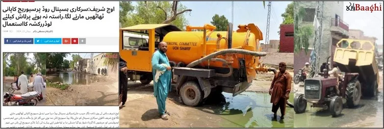 تٍفصیل کے مطابق گذشتہ روز باغی ٹی وی پرایک شائع ہوئی کہ اوچ شریف کےسرکاری ہسپتال روڈ پرسیوریج کاپانی ٹھاٹھیں مارنے لگا ہے ،راستہ نہ ہونے پرفوت ہوجانے والے شخص کی لاش کیلئے ورثاء لوڈررکشہ کااستعمال کرنا پڑنا، کیونکہ یہاں سے ایمبولینس نہیں گذرسکتی تھی جس کی بنا پر انہوں نے اپنے پیارے کی ڈیڈ باڈی گندے پانی سے عبور کرنے کے لیے لوڈر رکشہ کا استعمال کیا ، ڈیڈ باڈی گندے پانی سے عبور ہونے کی ویڈیوز وائرل ہونے پر انتظامیہ کی بے حسی پر عوام نے غم و غصّے کا اظہار کیا ،