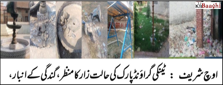 اوچ شریف ،باغی ٹی وی(نامہ نگارحبیب خان) کروڑوں روپے کی لاگت سے تعمیر ہونے والا ٹینکی گراؤنڈ پارک تکمیل کے فوراً بعد ہی مسائل کا شکار ہو گیا ہے۔ جوگنگ ٹریک جگہ جگہ سے ٹوٹ چکا ہے، فوارہ چالو نہیں کیا گیا، اور پارک کے مختلف حصوں میں گندگی کے انبار لگے ہوئے ہیں۔