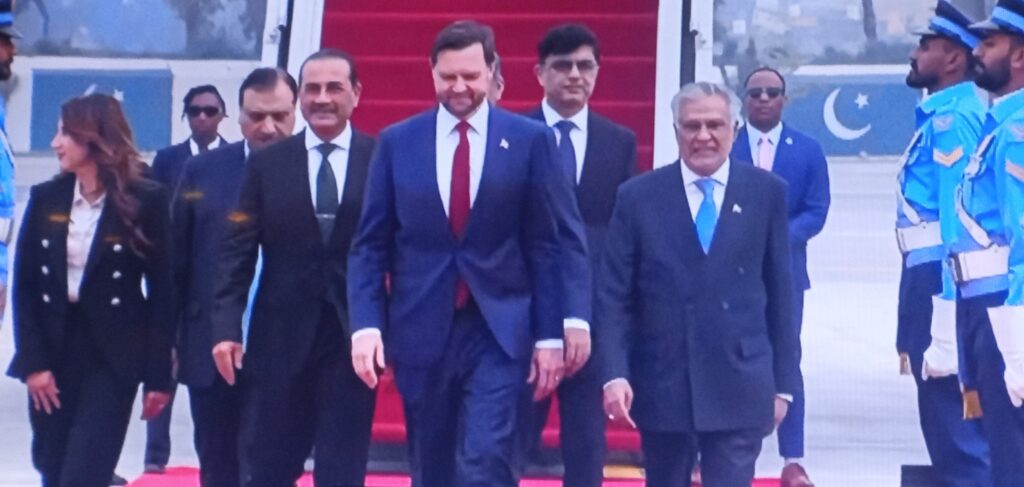 امریکی نائب صدر کی آمد کو نہ صرف پاکستان بلکہ عالمی سفارتی حلقوں میں انتہائی اہم پیش رفت قرار دیا جا رہا ہے، کیونکہ اس کے ساتھ ہی “اسلام آباد مذاکرات” کا باقاعدہ آغاز ہونے جا رہا ہے۔ذرائع کے مطابق امریکی نائب صدر کا طیارہ جیسے ہی اسلام آباد انٹرنیشنل ایئرپورٹ پر لینڈ ہوا، تو ان کے استقبال کے لیے پاکستان کے نائب وزیرِاعظم اسحاق ڈار،فیلڈ مارشل سید عاصم منیرموجود تھے،امریکی سفیر بھی اس موقع پر موجود تھیں،وزیر داخلہ محسن نقوی بھی اس موقع پر موجود تھے