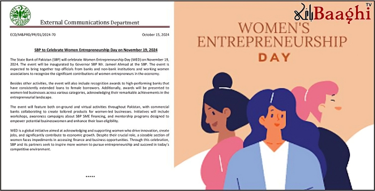 تفصیلات کے مطابق گورنر اسٹیٹ بینک آف پاکستان جمیل احمد کی ہدایت پر 19 نومبر کو بینک دولت پاکستان کے زیر اہتمام ویمن انٹرپینورشپ ڈے منایا جائے گا۔ اس دن کا مقصد ایسی خواتین کی حوصلہ افزائی اور انہیں اعانت فراہم کرنا ہے جو جدت پسند ہیں، روزگار کے مواقع پیدا کر رہی ہیں اور معاشی نمو میں اپنا کردار ادا کر رہی ہیں۔